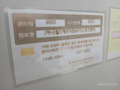 코너명: (하나)월드메르디앙APT(스포츠센터)작업일: 2026-02-18청소형태: 간이청소회차: 5회차작업확인: 미확인전송: 대기사진수: 3시작시간: 1119마침시간: 1123 2번 읽음