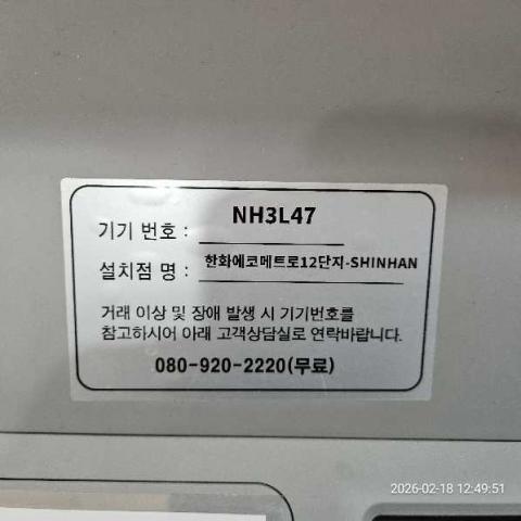 코너명: 한화에코메트로12단지-SHINHAN작업일: 2026-02-18청소형태: 간이청소회차: 1회차작업확인: 미확인전송: 대기사진수: 3시작시간: 1248마침시간: 1252 5번 읽음