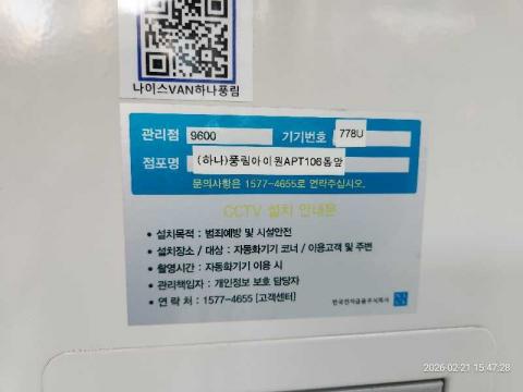코너명: (하나)풍림아이원APT106동앞작업일: 2026-02-21청소형태: 간이청소회차: 1회차작업확인: 미확인전송: 대기사진수: 3시작시간: 1547마침시간: 1551 5번 읽음