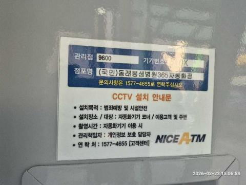 코너명: (국민)동래봉생병원365자동화점작업일: 2026-02-22청소형태: 간이청소회차: 1회차작업확인: 미확인전송: 대기사진수: 4시작시간: 1504마침시간: 1509 6번 읽음
