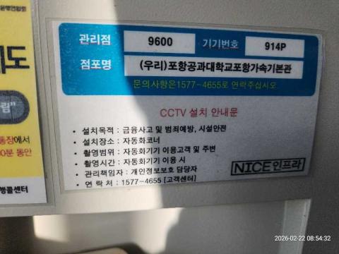코너명: (우리)포항공과대학교포항가속기본관작업일: 2026-02-22청소형태: 간이청소회차: 1회차작업확인: 미확인전송: 대기사진수: 4시작시간: 0854마침시간: 0855 7번 읽음