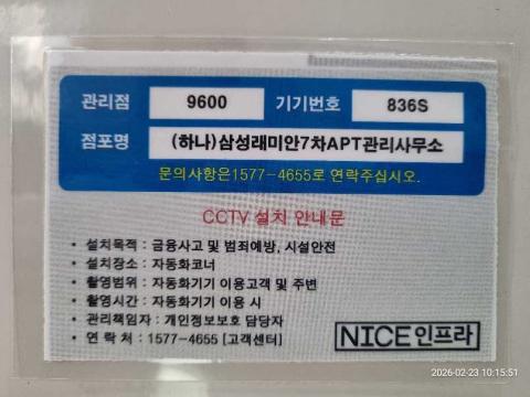 코너명: (하나)삼성래미안7차APT관리사무소작업일: 2026-02-23청소형태: 간이청소회차: 1회차작업확인: 미확인전송: 대기사진수: 3시작시간: 1013마침시간: 1018 5번 읽음