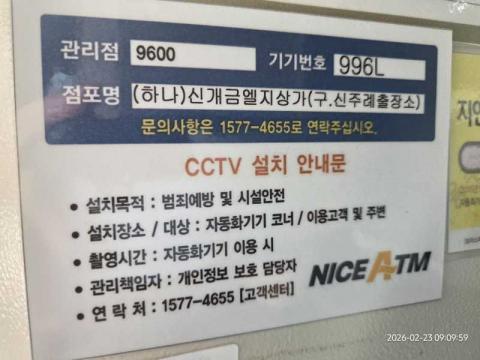 코너명: (하나)신개금엘지상가(구.신주례출장소)작업일: 2026-02-23청소형태: 간이청소회차: 1회차작업확인: 미확인전송: 대기사진수: 4시작시간: 0909마침시간: 0913 5번 읽음