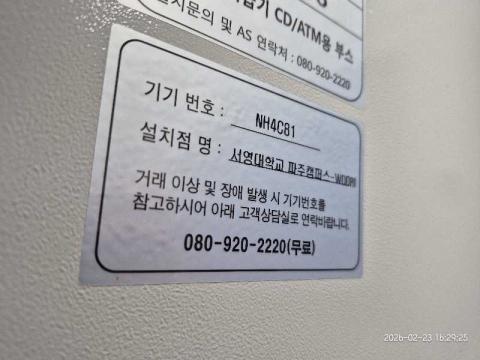 코너명: 서영대학교 파주캠퍼스-WOORI작업일: 2026-02-23청소형태: 간이청소회차: 3회차작업확인: 미확인전송: 대기사진수: 4시작시간: 1629마침시간: 1630 5번 읽음