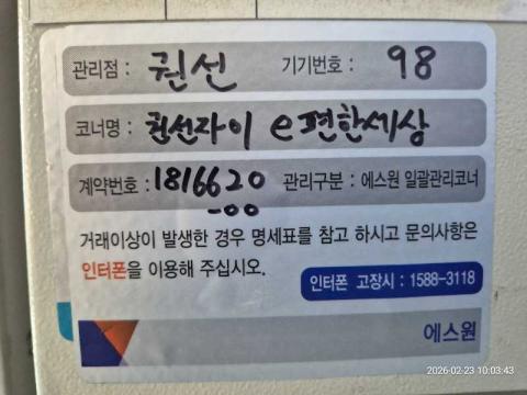 코너명: 수원권선자이 이편한세상 아파트 입구작업일: 2026-02-23청소형태: 간이청소회차: 4회차작업확인: 미확인전송: 대기사진수: 4시작시간: 1003마침시간: 1003 4번 읽음