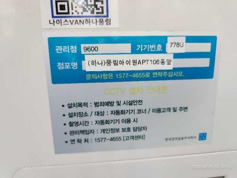 코너명: (하나)풍림아이원APT106동앞작업일: 2026-02-25청소형태: 간이청소회차: 1회차작업확인: 미확인전송: 대기사진수: 3시작시간: 1517마침시간: 1522 2번 읽음