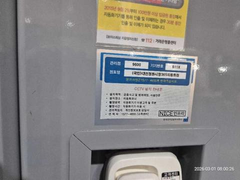 코너명: (국민)대전정원시장365자동화점작업일: 2026-03-01청소형태: 간이청소회차: 1회차작업확인: 미확인전송: 대기사진수: 3시작시간: 0800마침시간: 0807 4번 읽음