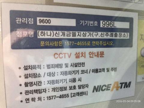 코너명: (하나)신개금엘지상가(구.신주례출장소)작업일: 2026-03-04청소형태: 간이청소회차: 1회차작업확인: 미확인전송: 대기사진수: 4시작시간: 0905마침시간: 0908 4번 읽음