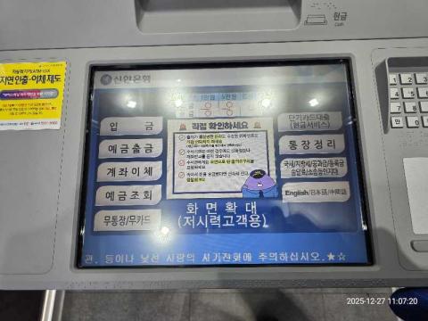 코너명: 롯데슈퍼태백점-SHINHAN(V)작업일: 2025-12-27청소형태: 간이청소회차: 3회차작업확인: 미확인전송: 대기사진수: 5시작시간: 1105마침시간: 1107 4번 읽음