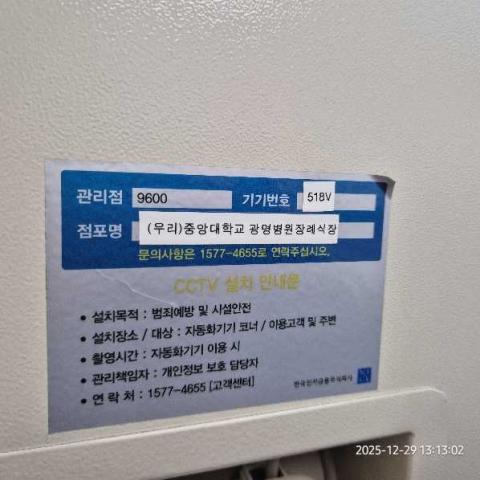 코너명: (우리)중앙대학교광명병원장례식장작업일: 2025-12-29청소형태: 간이청소회차: 2회차작업확인: 미확인전송: 대기사진수: 4시작시간: 1313마침시간: 1313 6번 읽음