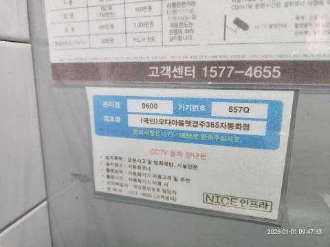 코너명: (국민)모다아울렛경주365자동화점작업일: 2026-01-01청소형태: 간이청소회차: 1회차작업확인: 미확인전송: 대기사진수: 3시작시간: 0947마침시간: 0947 3번 읽음
