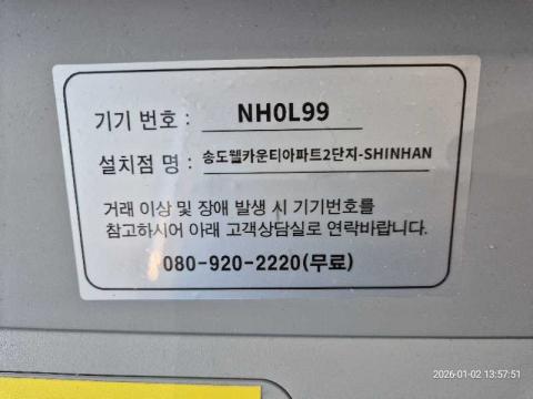 코너명: 송도웰카운티아파트2단지-SHINHAN작업일: 2026-01-02청소형태: 간이청소회차: 1회차작업확인: 미확인전송: 대기사진수: 4시작시간: 1357마침시간: 1400 4번 읽음