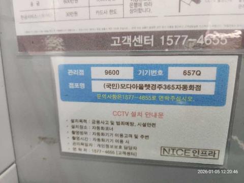 코너명: (국민)모다아울렛경주365자동화점작업일: 2026-01-05청소형태: 간이청소회차: 1회차작업확인: 미확인전송: 대기사진수: 3시작시간: 1220마침시간: 1221 2번 읽음