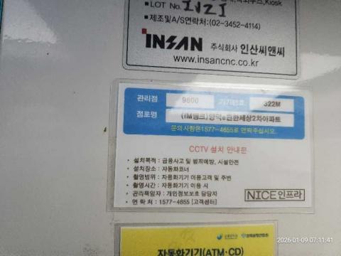 코너명: (IM뱅크)양덕e편한세상2차아파트작업일: 2026-01-09청소형태: 간이청소회차: 1회차작업확인: 미확인전송: 대기사진수: 4시작시간: 0711마침시간: 0712 5번 읽음