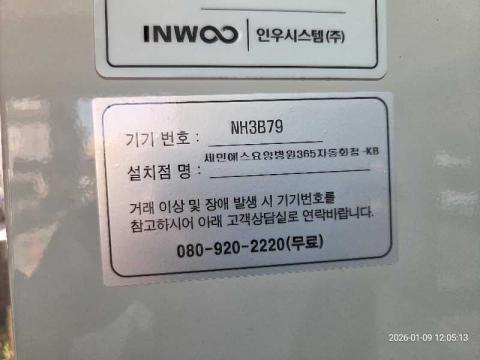 코너명: 세민에스요양병원365자동화점-KB작업일: 2026-01-09청소형태: 간이청소회차: 2회차작업확인: 미확인전송: 대기사진수: 4시작시간: 1204마침시간: 1208 3번 읽음