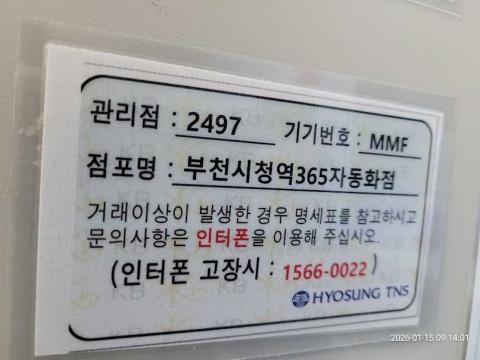 코너명: (목)부천시청역 365자동화점작업일: 2026-01-15청소형태: (목)입점회차: 1회차작업확인: 미확인전송: 대기사진수: 5시작시간: 0914마침시간: 0919 1번 읽음
