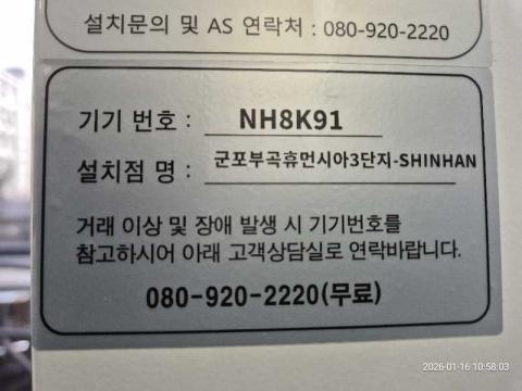 코너명: 군포부곡휴먼시아3단지-SHINHAN작업일: 2026-01-16청소형태: 간이청소회차: 3회차작업확인: 미확인전송: 대기사진수: 2시작시간: 1058마침시간: 1100 5번 읽음