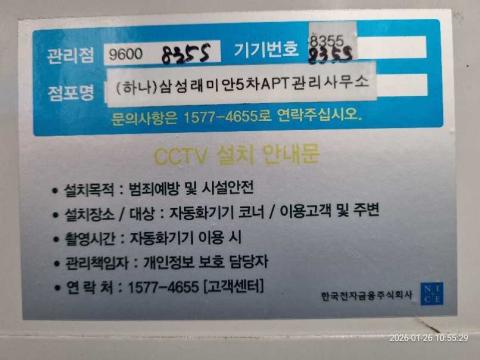 코너명: (하나)삼성래미안5차APT관리사무소작업일: 2026-01-26청소형태: 간이청소회차: 1회차작업확인: 미확인전송: 대기사진수: 3시작시간: 1055마침시간: 1100 3번 읽음