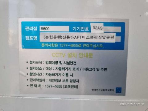 코너명: (농협은행)신동아APT버스승강장맞은편작업일: 2026-01-28청소형태: 간이청소회차: 1회차작업확인: 미확인전송: 대기사진수: 4시작시간: 1550마침시간: 1555 2번 읽음