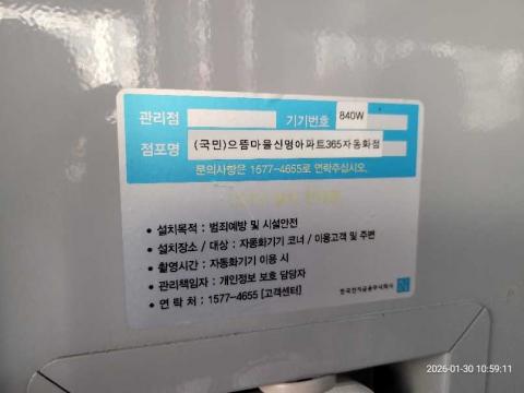 코너명: (국민)으뜸마을신명아파트365자동화점작업일: 2026-01-30청소형태: 간이청소회차: 1회차작업확인: 미확인전송: 대기사진수: 4시작시간: 1059마침시간: 1108 2번 읽음
