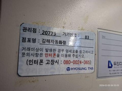 코너명: 김해자동화점작업일: 2026-02-05청소형태: 대청소회차: 1회차작업확인: 미확인전송: 실패전송메시지: SUCCESS_COUNT=(8), ERROR_COUNT=(0), RESULT_CODE=(7), RESULT_MESSAGE=(8장까지만 등록되었습니다.)사진수: 12시작시간: 0653마침시간: 0658 3번 읽음