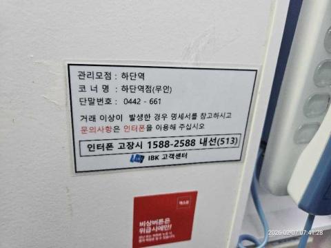 코너명: 하단역점(무인)작업일: 2026-02-07청소형태: 대청소회차: 1회차작업확인: 미확인전송: 완료전송메시지: SUCCESS_COUNT=(15), ERROR_COUNT=(0), RESULT_CODE=(0), RESULT_MESSAGE=(업로드 성공)사진수: 15시작시간: 0741마침시간: 0744 1번 읽음