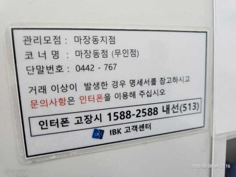 코너명: 마장동점(무인)작업일: 2026-02-08청소형태: 대청소회차: 1회차작업확인: 미확인전송: 완료전송메시지: SUCCESS_COUNT=(16), ERROR_COUNT=(0), RESULT_CODE=(0), RESULT_MESSAGE=(업로드 성공)사진수: 16시작시간: 0927마침시간: 0937