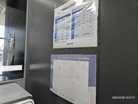 코너명: 포승공단점작업일: 2026-02-08청소형태: 대청소회차: 1회차작업확인: 미확인전송: 완료전송메시지: {"resultCd":"1","resultMsg":"정상 처리 되었습니다."}사진수: 19시작시간: 1305마침시간: 1315 1번 읽음