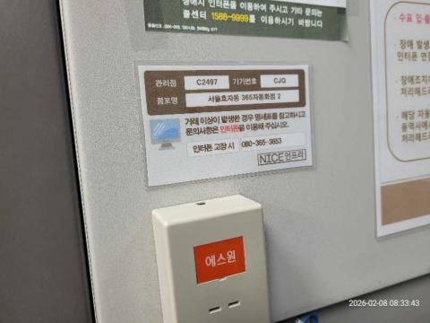 코너명: 서울효자동 365자동화점작업일: 2026-02-08청소형태: 대청소회차: 1회차작업확인: 미확인전송: 완료전송메시지: {"resultCd":"1","resultMsg":"정상 처리 되었습니다."}사진수: 20시작시간: 0833마침시간: 0853