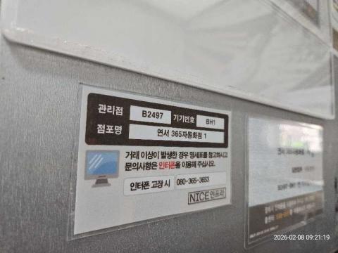 코너명: 연서 365자동화점작업일: 2026-02-08청소형태: 대청소회차: 1회차작업확인: 미확인전송: 완료전송메시지: {"resultCd":"1","resultMsg":"정상 처리 되었습니다."}사진수: 18시작시간: 0920마침시간: 0933