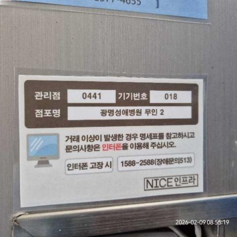 코너명: 광명성애병원 무인작업일: 2026-02-09청소형태: 대청소회차: 2회차작업확인: 미확인전송: 완료전송메시지: {"resultCd":"1","resultMsg":"정상 처리 되었습니다."}사진수: 18시작시간: 0855마침시간: 0858 2번 읽음