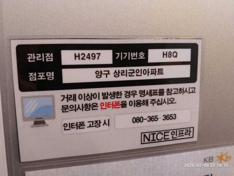 코너명: 양구 상리군인아파트작업일: 2026-02-09청소형태: 대청소회차: 2회차작업확인: 미확인전송: 완료전송메시지: {"resultCd":"1","resultMsg":"정상 처리 되었습니다."}사진수: 16시작시간: 2212마침시간: 2222