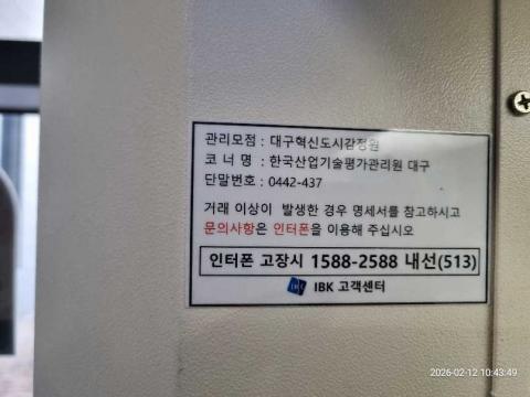 코너명: 대구 한국산업기술평가관리원작업일: 2026-02-12청소형태: 대청소회차: 1회차작업확인: 미확인전송: 완료전송메시지: SUCCESS_COUNT=(7), ERROR_COUNT=(0), RESULT_CODE=(0), RESULT_MESSAGE=(업로드 성공)사진수: 7시작시간: 1043마침시간: 1044 1번 읽음