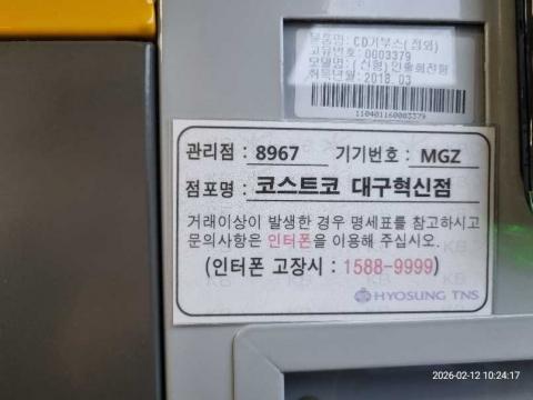 코너명: 코스트코 대구혁신점작업일: 2026-02-12청소형태: 대청소회차: 1회차작업확인: 미확인전송: 완료전송메시지: SUCCESS_COUNT=(9), ERROR_COUNT=(0), RESULT_CODE=(0), RESULT_MESSAGE=(업로드 성공)사진수: 9시작시간: 1024마침시간: 1032 2번 읽음
