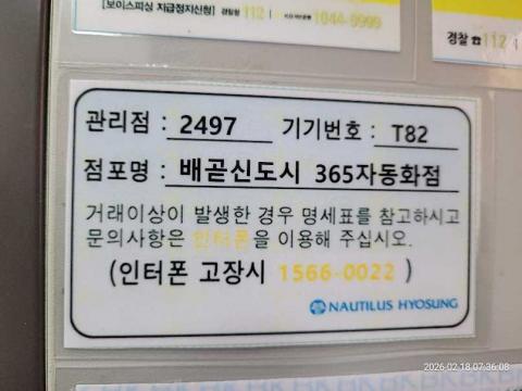 코너명: 배곧신도시 365자동화점작업일: 2026-02-18청소형태: 대청소회차: 2회차작업확인: 미확인전송: 완료전송메시지: SUCCESS_COUNT=(20), ERROR_COUNT=(0), RESULT_CODE=(0), RESULT_MESSAGE=(업로드 성공)사진수: 20시작시간: 0736마침시간: 0753 4번 읽음
