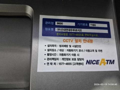 코너명: (부산)대연대우푸르지오작업일: 2026-02-19청소형태: 대청소회차: 1회차작업확인: 미확인전송: 완료전송메시지: {"resultCd":"1","resultMsg":"정상 처리 되었습니다."}사진수: 11시작시간: 1402마침시간: 1409 1번 읽음