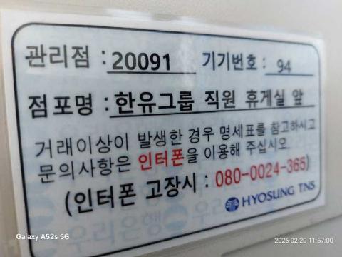 코너명: 한유그룹 직원 휴게실 앞작업일: 2026-02-20청소형태: 대청소회차: 1회차작업확인: 미확인전송: 완료전송메시지: SUCCESS_COUNT=(11), ERROR_COUNT=(0), RESULT_CODE=(0), RESULT_MESSAGE=(업로드 성공)사진수: 11시작시간: 1157마침시간: 1201