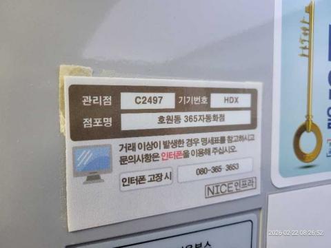 코너명: 호원동 365자동화점작업일: 2026-02-22청소형태: 대청소회차: 2회차작업확인: 미확인전송: 완료전송메시지: {"resultCd":"1","resultMsg":"정상 처리 되었습니다."}사진수: 19시작시간: 0826마침시간: 0838 1번 읽음