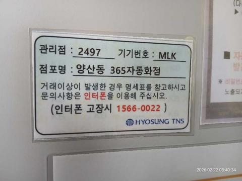 코너명: 양산동 365자동화점작업일: 2026-02-22청소형태: 대청소회차: 1회차작업확인: 미확인전송: 완료전송메시지: SUCCESS_COUNT=(19), ERROR_COUNT=(0), RESULT_CODE=(0), RESULT_MESSAGE=(업로드 성공)사진수: 19시작시간: 0840마침시간: 0855 3번 읽음