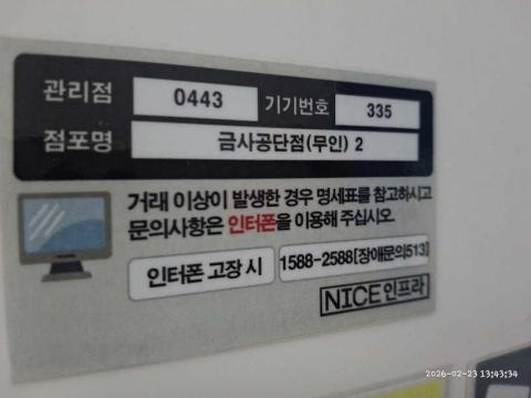 코너명: 금사공단점(무인)작업일: 2026-02-23청소형태: 대청소회차: 1회차작업확인: 미확인전송: 완료전송메시지: {"resultCd":"1","resultMsg":"정상 처리 되었습니다."}사진수: 14시작시간: 1342마침시간: 1344 2번 읽음