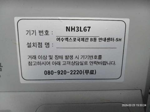 코너명: 여수엑스포국제관 B동 안내센터-SH작업일: 2026-02-23청소형태: 대청소회차: 1회차작업확인: 미확인전송: 대기사진수: 12시작시간: 1553마침시간: 1554 3번 읽음