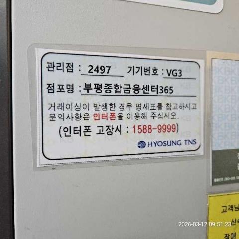 코너명: (목)부평종합금융센터 365자동화점작업일: 2026-03-12청소형태: (목)입점회차: 1회차작업확인: 미확인전송: 대기사진수: 4시작시간: 0945마침시간: 0955 1번 읽음