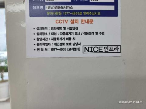 코너명: (경남)경동도시가스작업일: 2026-03-22청소형태: 대청소회차: 1회차작업확인: 미확인전송: 완료전송메시지: {"resultCd":"1","resultMsg":"정상 처리 되었습니다."}사진수: 12시작시간: 1258마침시간: 1304